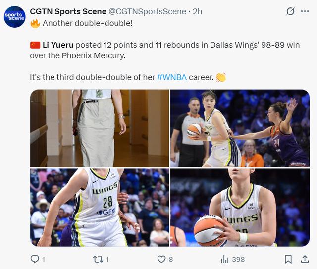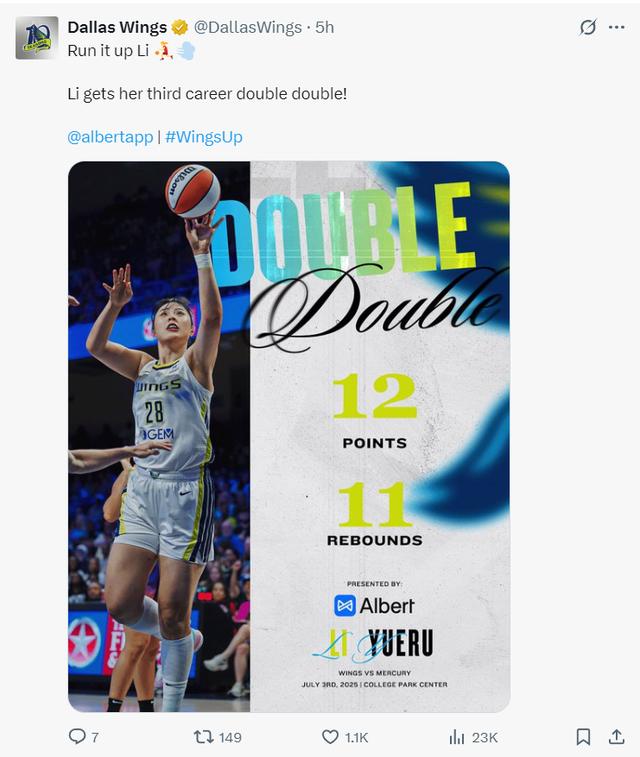 美媒:有是一个两双数据,李月汝拿到12+11帮助飞翼取胜,这是他WNBA生涯第三次两双,这也是李月汝生涯首次单场10+罚球。