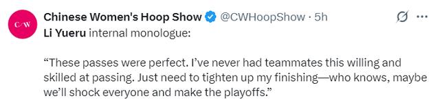 李月汝在赛后表示:从未遇到过这样的队友,她们的传球既熟练又精准,这些传球太完美了。接下来我需要提升自己的篮下终结能力,也许我们能给人们带来惊喜冲入季后赛呢?