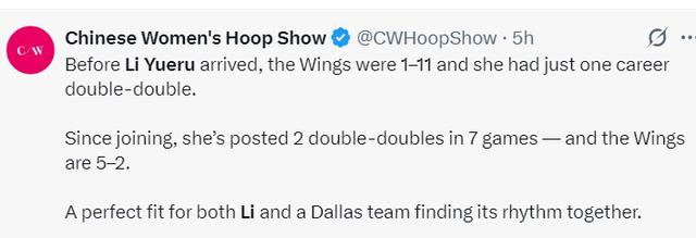 在李月汝到来飞翼之前是1胜11负,而李月汝生涯也只有1次两双,自从李月汝加盟飞翼后她7场比赛拿到2次两双,飞翼战绩是5胜2负,很明显飞翼正是最适合李月汝的球队,她已经跟这支球队磨合好且形成了默契。