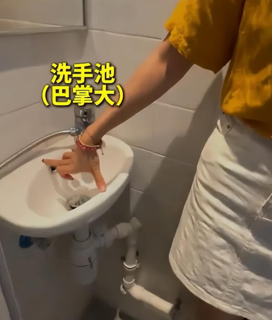 左边是巴掌大的洗手池,右边是马桶,旁边还有一个花洒,空间比较小,基本只能容纳一个人,但是洗漱、如厕、淋浴全都可以一次性解决。